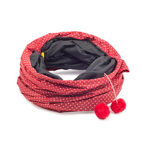 The tunnel features two pop-up holes for cats to jump out of. These can be used to dangle toys into when you and your cat play together. For added amusement a toy dangles at the tunnel's mouth for batting and playing. This bold red polka patterned tunnel folds conveniently flat when not in use for compact and simple storage.