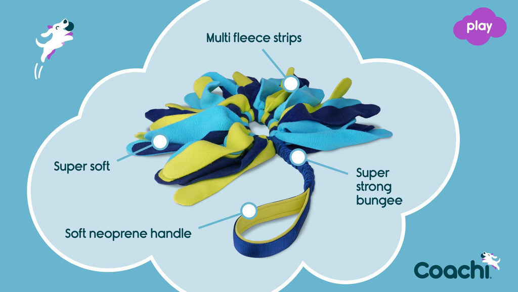 The soft but strong, Coachi Tuggi Spider features a strong bungee with a soft neoprene handle. It is great for games of Tug and also as a fun and enticing toy for games and rewarding recall, it can also help interrupt play biting & chewing.
