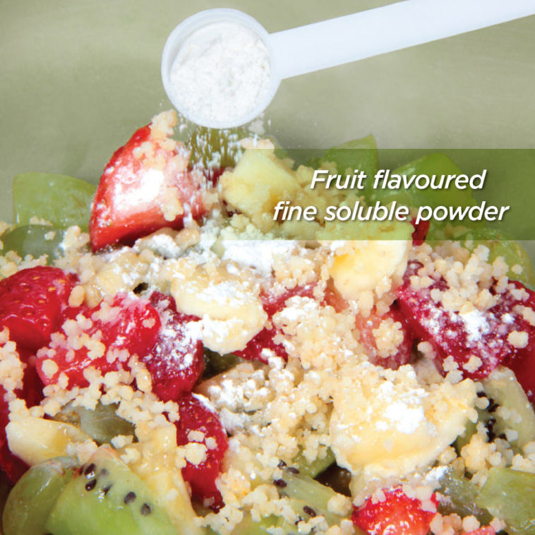 - Is an ultra fine highly palatable powder that does not cake over time and dissolves quickly.