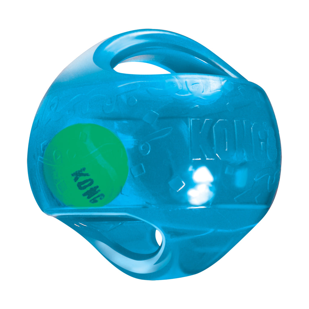 The KONG Jumbler is a two-in-one ball toy for twice the interactive fun. The interior tennis ball and loud squeak entice play, while the handles make pickup and shaking easy. The Jumbler stands up to tough play, making it ideal for games of fetch. Available in two shapes and sizes, the KONG Jumbler will ensure an exciting, active play session for you and your dog.