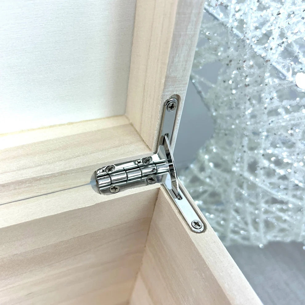 The sturdy wooden box is made from white painted solid pine wood. The boxes have chrome plated metal hinges and an elegant clasp to seal the box ensuring its contents are safe for years to come.